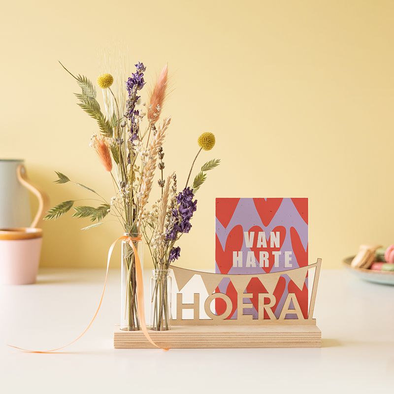 Sweet memories! 🌸 Feliciteer iemand met een blijvende herinnering. Dit brievenbuscadeau bevat een stijlvolle houten standaard en twee vaasjes met prachtige droogbloemen. De standaard heeft een speciale plek voor jouw persoonlijke gefeliciteerd kaartje. Een droogbloemen boeketje dat nooit zal verwelken.