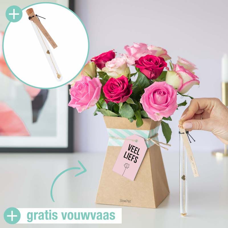 Maak iemand blij met bloemen en een prachtig armbandje met hartje! Wie verras jij met deze originele combinatie? Deze mooie bos rozen in vier tinten in combinatie met een gouden armbandje met hartje is een uniek geschenk. Een echt verrassingspakketje waarmee je jouw geliefde, moeder, zusje of collega helemaal inpakt!