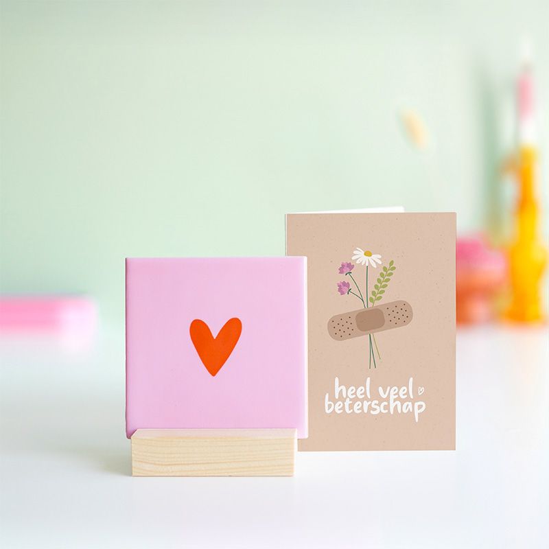Wens iemand beterschap op een originele manier! Dit roze tegeltje is een brievenbus cadeau dat laat zien dat je aan iemand denkt en beterschap wenst. Zet het in de houder of geef het een plekje aan de muur: een lichtpuntje op de momenten dat het nodig is. Wie wens jij beterschap met dit kleurrijke en originele cadeau? 🩷