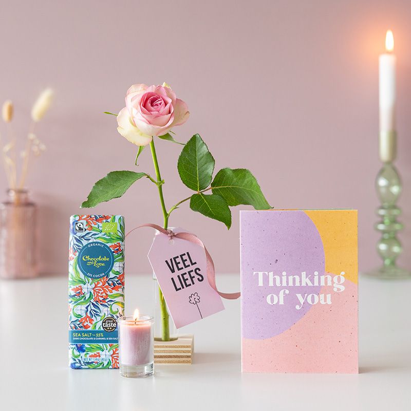 Laten weten dat je aan iemand denkt? Bezorg veel liefs door de brievenbus. Dit originele cadeau bestaat uit een roos in vaasje, Fairtrade chocoreep en mini kaars. De roze roos staat symbool voor veel moois zoals geluk, bewondering en dankbaarheid. Een warm gebaar om een hart onder de riem te steken.