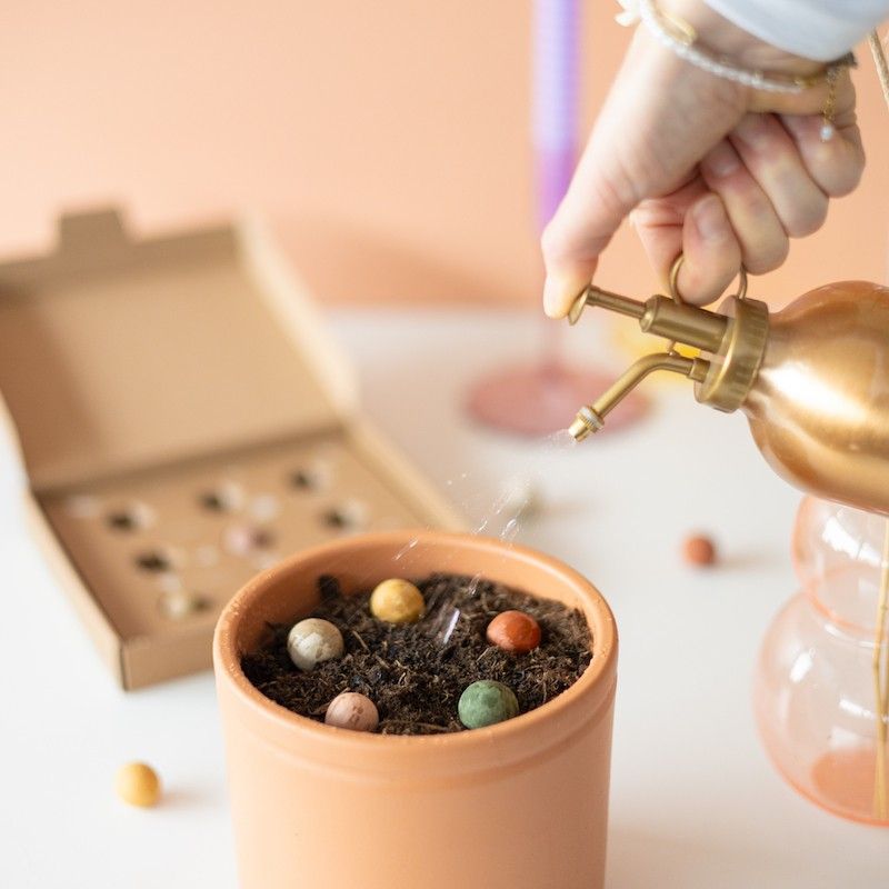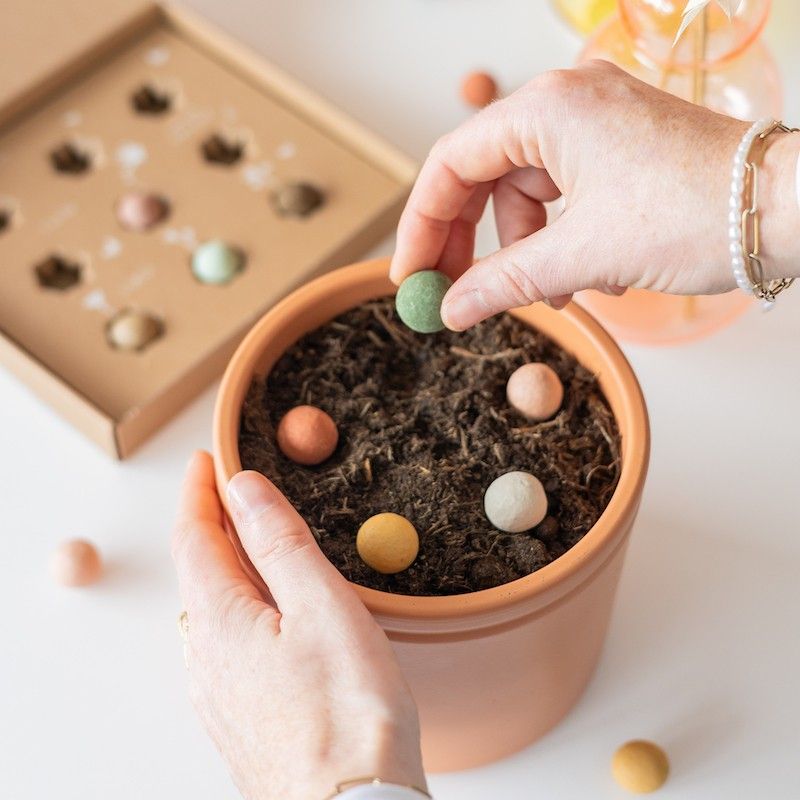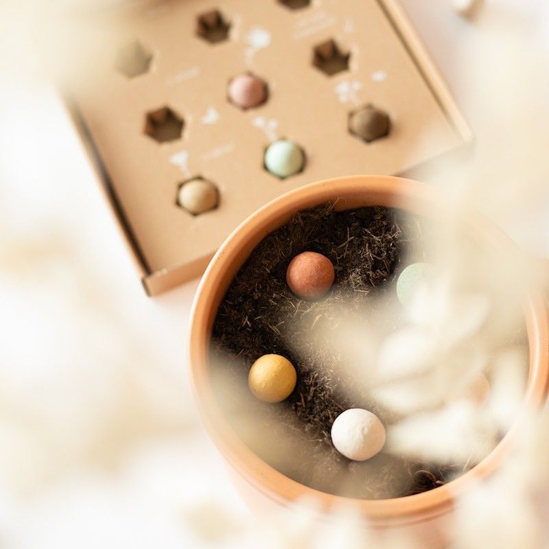 In het stijlvolle doosje vind je 9 zaaibommetjes, gemaakt in Nederland en met 100% natuurlijke ingrediënten en biologische, wilde bloemzaden. Kleurrijke bloemen zijn enorm belangrijk voor de aarde. Hoe meer bloemen, hoe meer voedsel voor de bijen, vlinders en hommels. Let’s spread some colour!