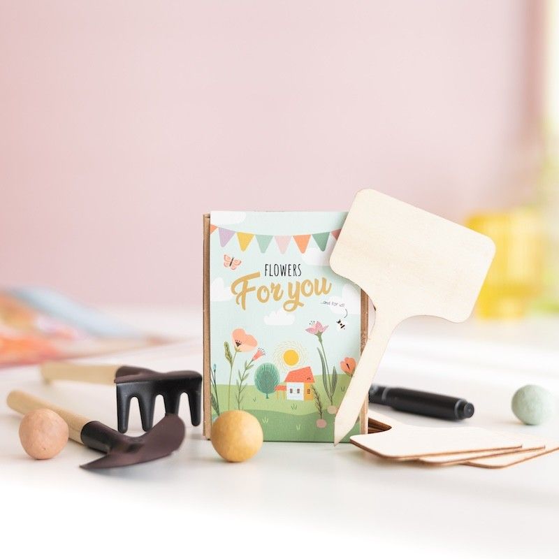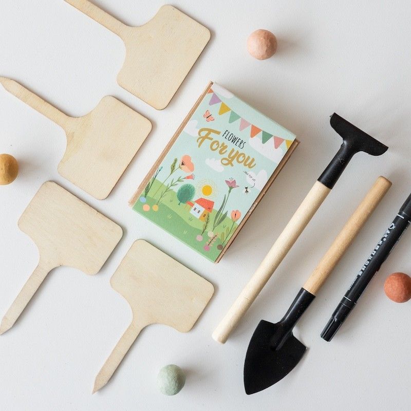 Inclusief mini tuinsetje! 🌱 Met dit leuke tuinsetje inclusief harkje, schepje, steeketiketten en pen - kan je al jouw zaadjes goed verzorgen. Kamille. Klaproos, vlasdotter of bolderik? Met de houten etiketten kun je alle groeiende bloemen of kruiden gemakkelijk herkennen.